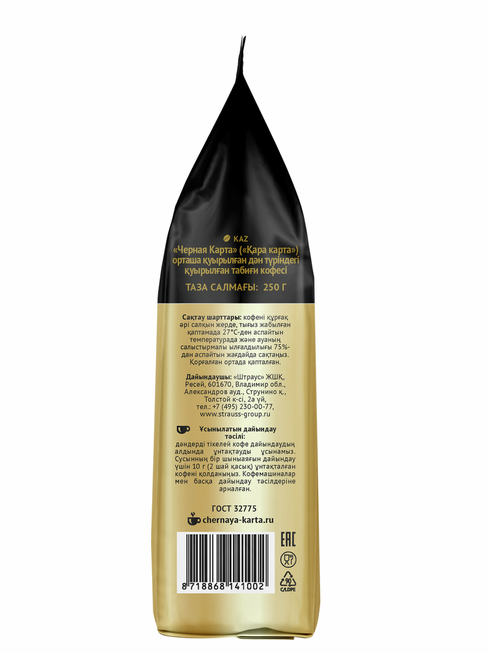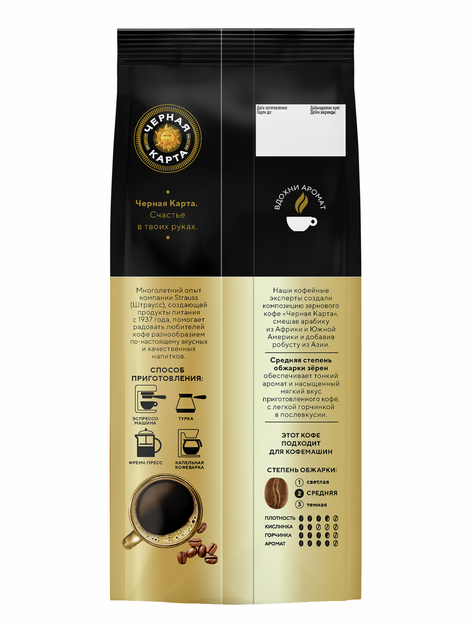Кофе Черная Карта в зернах, 250 г — ароматный кофе, который производят на высококачественном оборудовании. Готовый напиток характеризуется плотным и обволакивающим вкусом с нотками сухофруктов, сладким карамельным ароматом с оттенками свежих трав и интересным послевкусием какао. Представленный кофе обладает средней крепостью. Напиток выпускают в герметичной упаковке, которая идеально подходит для транспортировки и хранения — защищает содержимое от попадания влаги и посторонних запахов, а также сохраняет вкусо-ароматические характеристики зерен. Дома кофе следует перемолоть, для этого подойдет как ручная, так и автоматическая кофемолка. Как молотый кофе, так и зерна рекомендуется хранить в емкости с герметично закрывающейся крышкой. Готовить этот кофе можно в гейзерной кофеварке, кофемашине или кофейном аппарате, во френч-прессе, турке или просто заваривать в кружке. Его можно пить как в классическом исполнении (американо или эспрессо), так и дополнять молоком, сливками, мороженым, сахаром и сиропами.