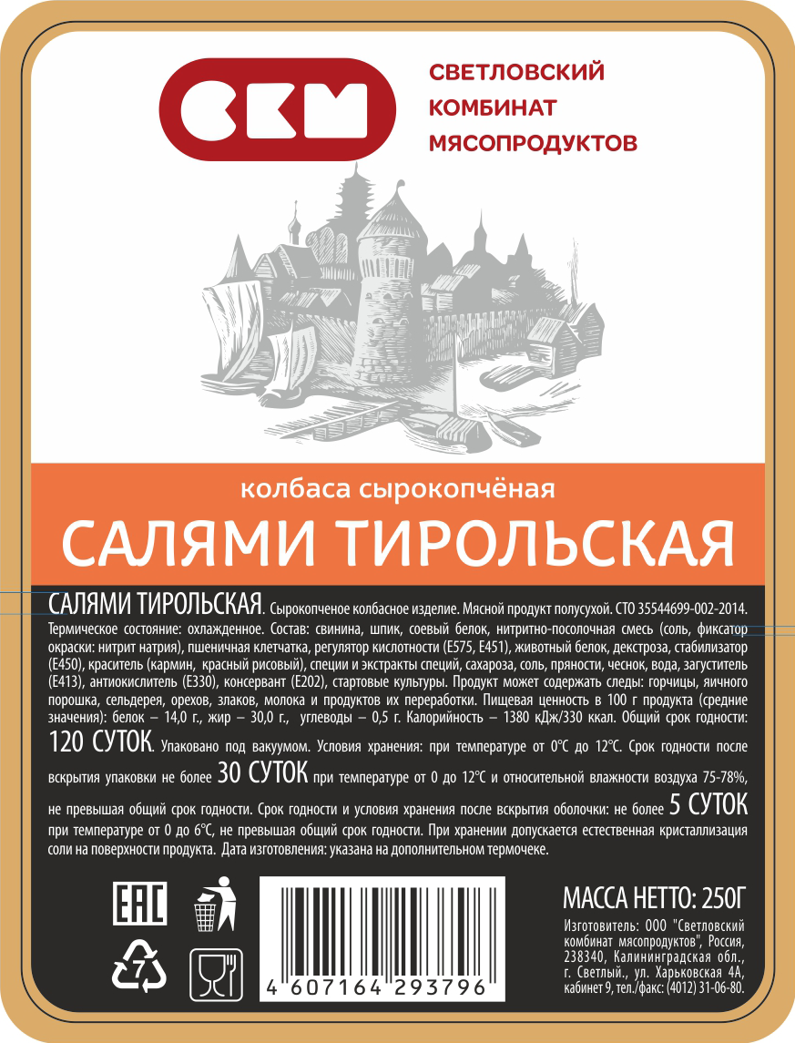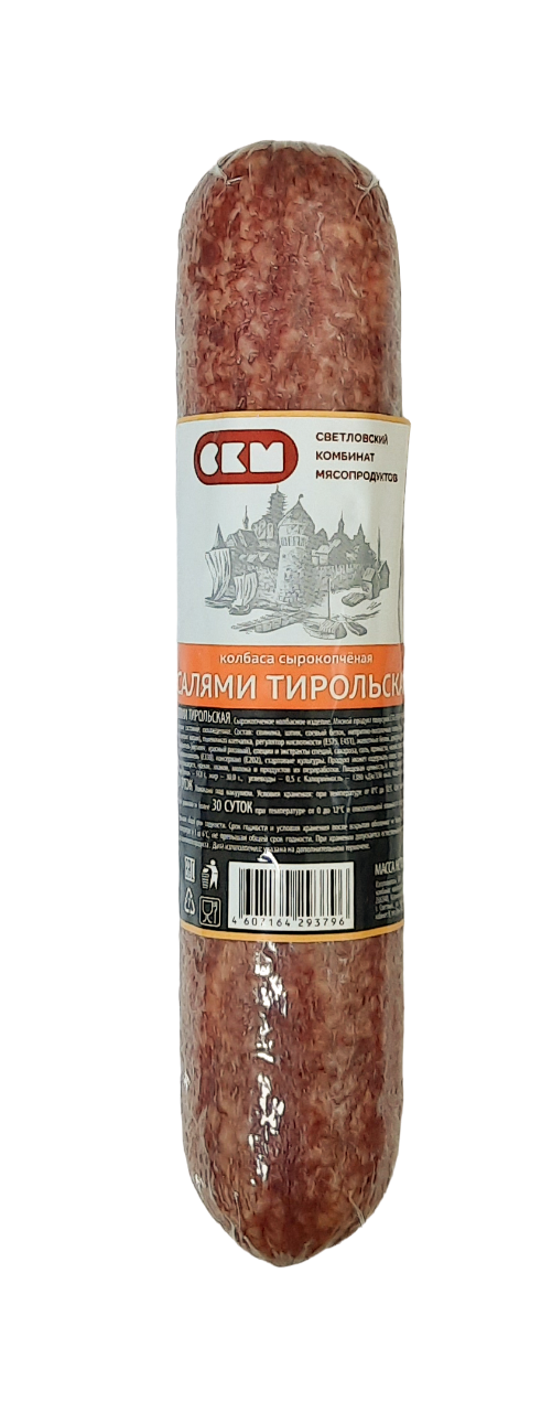 Колбаса Тирольская салями, 250 г – аппетитный мясной продукт, который украсит собой любой стол – как повседневный, так и праздничный. Сырокопченый деликатес обладает утонченным вкусом, приятным ароматом и плотной однородной структурой. Это позволяет нарезать салями максимально тоненькими слайсами и аккуратными кубиками. Сырокопченая колбаса – неотъемлемый компонент вкусных сытных завтраков. Сэндвичи и бутерброды с салями получаются невероятно соблазнительными и оригинальными. От них не откажутся даже малыши. Колбасу также можно подать с нежным омлетом и яичницей-глазуньей. Она может выступить одним из ингредиентов миниатюрных канапе, а также стать частью мясной тарелки. А начинка для несладкой выпечки на основе этого мясного деликатеса получится невероятно сочной и интересной. Салями прекрасно сочетается с прохладными напитками и свежий хрустящим багетом. Продукт достаточно питательный. Бутерброды с салями можно положить ребенку в школу и взять с собой в дорогу и в офис, чтобы устроить сытный перекус. Продукт быстро утоляет голод и дает заряд энергии на длительное время. Салями заключена в оболочку, которую необходимо снять перед употреблением.
