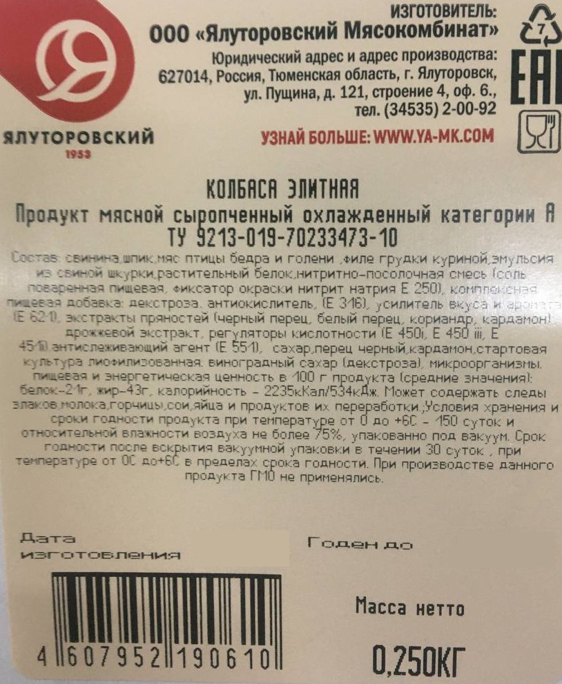 Колбаса Ялуторовский МК Элитная сырокопченая, 250г