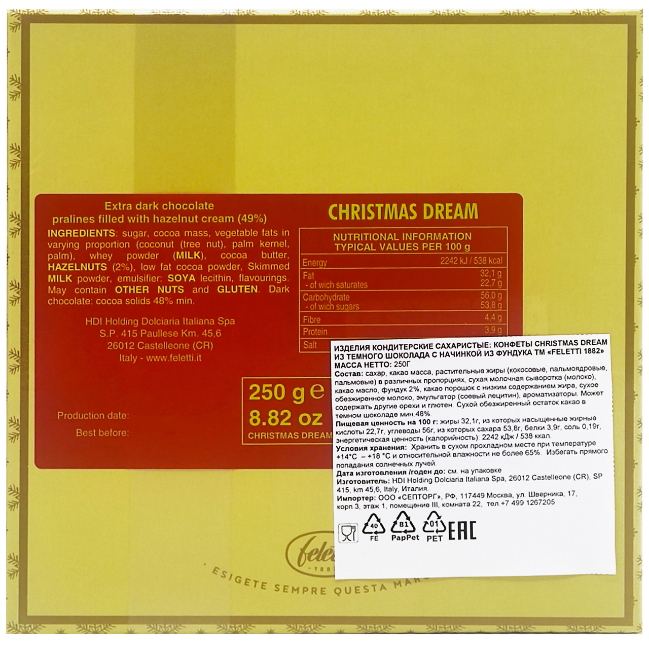 Изысканный набор шоколадных конфет, приготовленных из отборных ингредиентов по рецептам итальянских шоколатье, подавайте к чаю, кофе или любимому ликёру. Нарядная упаковка с дизайном новогодних ёлочных игрушек позволит сделать набор отличным подарком к Новому году.