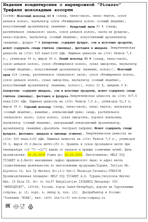 Конфеты Vanelli Picasso трюфель ассорти, 250г