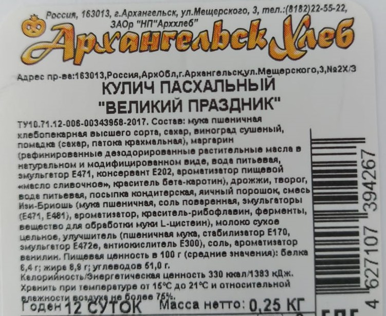Кулич Архангельскхлеб Великий праздник пасхальный, 250г