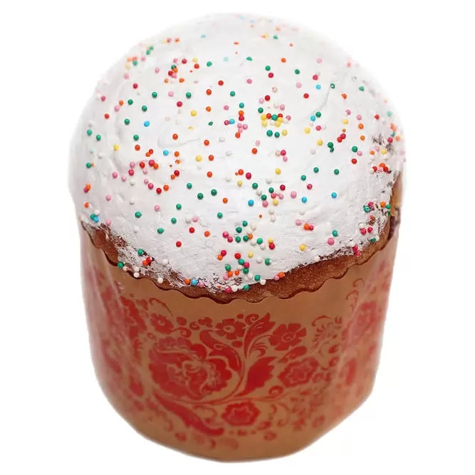 Классический пасхальный кулич. Можно подать к столу как самостоятельный богатый десерт. Он отлично сочетается с молоком и молочными продуктами. Выпечен по традиционной рецептуре в бумажной термоформе, глазирован белой помадкой, украшен яркой разноцветной сахарной посыпкой.
