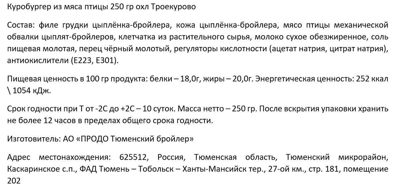 Куробургер из мяса цыпленка-бройлера Троекурово охлажденный, 250г