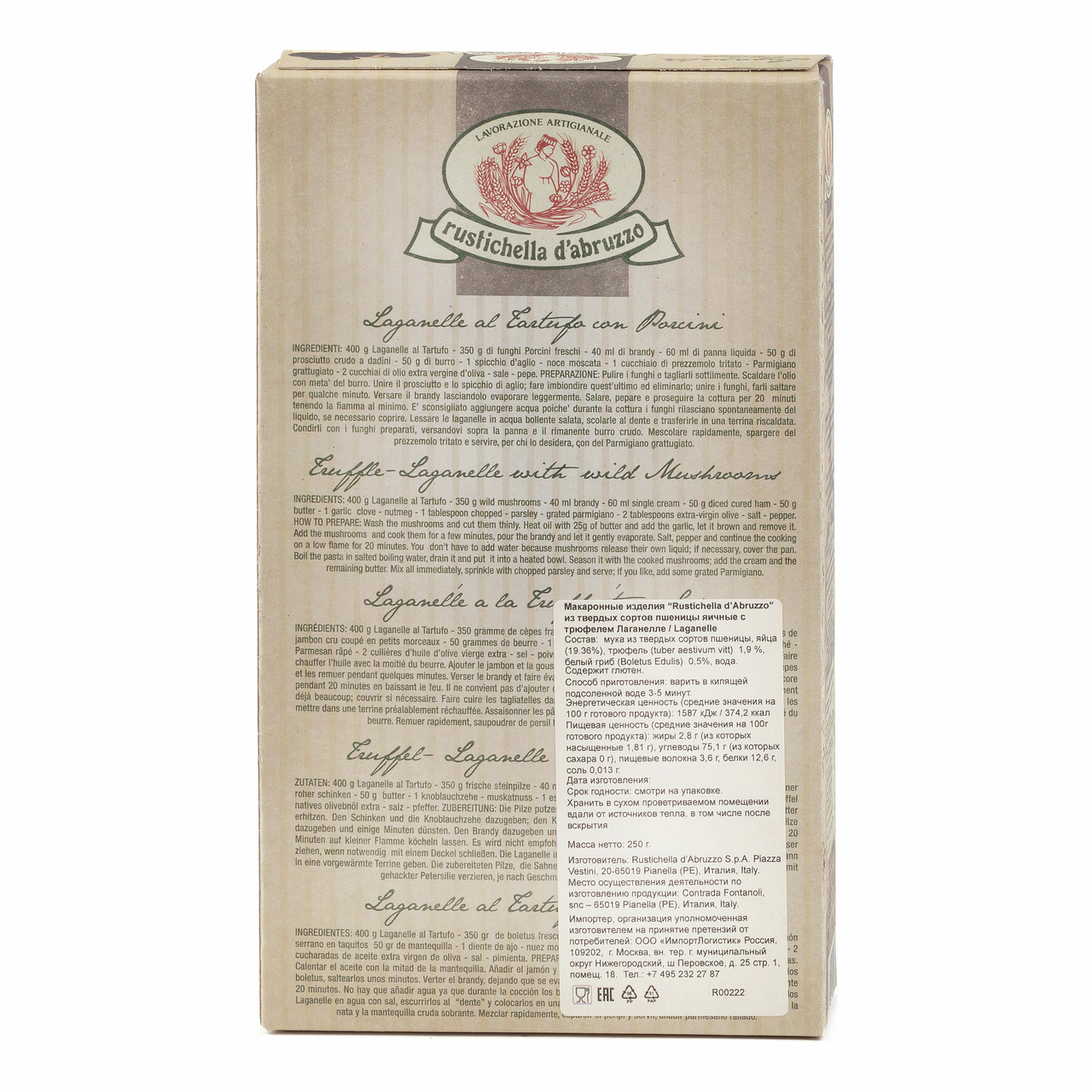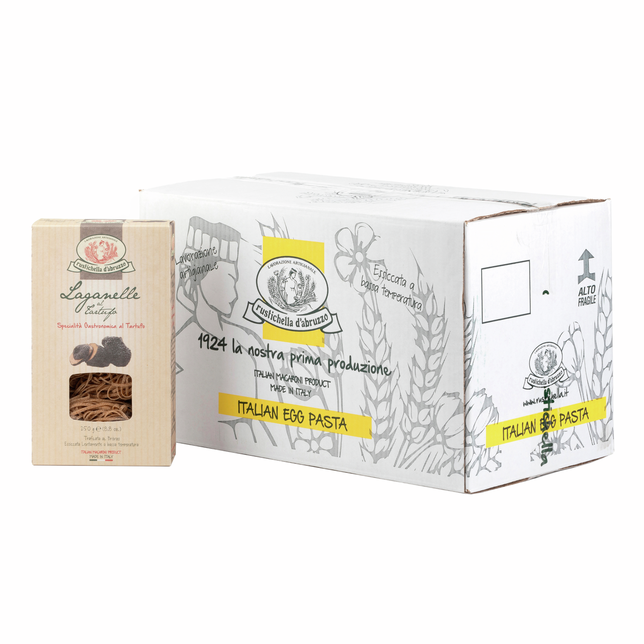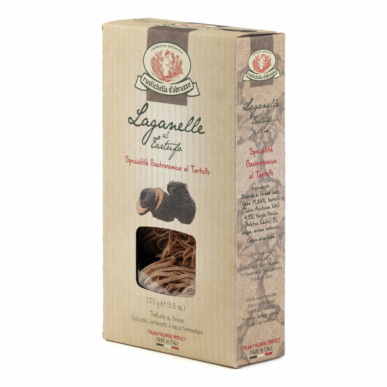 В добавок к оригинальной яичной пасте в форматах лаганелле, штуццикарелли и паппарделле, Rustichella d'Abruzzo на протяжении долгого времени отбирала лучшие натуральные ингредиенты, чтобы предложить своим покупателям еще больше вкусов, ароматов и запахов, которые дарит природа. Некоторые из этих ингредиентов типичны для региона Абруццо, например, черный трюфель.