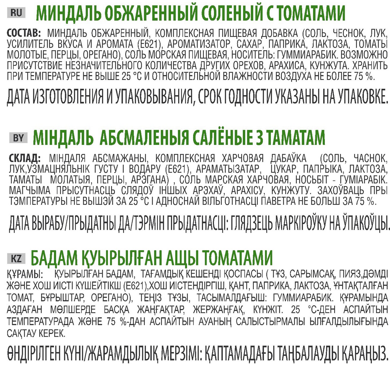 Миндаль обжаренный, комплексная пищевая добавка (соль, чеснок, лук, усилитель вкуса и аромата (e621), ароматизатор, сахар, паприка, лактоза, томаты молотые, перцы, орегано), соль морская пищевая, носитель: гуммиарабик.