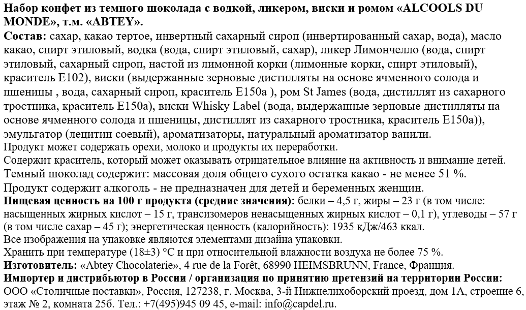 Сахар, какао тертое, инвертный сахарный сироп инвертированный сахар, вода, масло какао, спирт этиловый, водка вода, спирт этиловый, сахар, ликер Лимончелло вода, спирт этиловый, сахарный сироп, настой из лимонной корки лимонные корки, спирт этиловый, краситель Е102, виски выдержанные зерновые дистилляты на основе ячменного солода и пшеницы , вода, сахарный сироп, краситель Е150а , ром St James вода, дистиллят из сахарного тростника, краситель Е150а, виски Whisky Label вода, выдержанные зерновые дистилляты на основе ячменного солода и пшеницы, дистиллят из сахарного тростника, краситель Е150а, эмульгатор лецитин соевый, ароматизаторы, натуральный ароматизатор ванили.