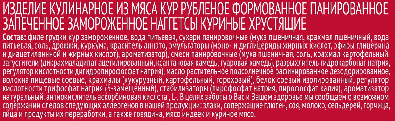 Филе грудки кур замороженное, вода питьевая, сухари панировочные мука пшеничная, вода питьевая, соль, дрожжи, куркума, краситель аннато, эмульгаторы моно - и диглицериды жирных кислот, эфиры глицерина и диацетилвинной и жирных кислот, продукт плавленый с сыром [вода питьевая, жир специального назначения масла растительные рафинированные дезодорированные гидрогенизированные, переэтерифицированные подсолнечное, рапсовое, крахмал картофельный, молоко сухое обезжиренное, комплексная пищевая добавка эмульгаторы полифосфат натрия, дигидропирофосфат натрия, регуляторы кислотности цитрат натрия 3-замещенный, гидрокарбонат натрия, сыр молоко пастеризованное, бактериальная закваска мезофильных молочнокислых бактерий, молокосвертывающий ферментный препарат микробного происхождения, соль, ароматизатор, краситель каротины, регулятор кислотности лимонная кислота], масло растительное подсолнечное рафинированное дезодорированное, смесь панировочная мука пшеничная, соль, загуститель гуаровая камедь, крахмал картофельный, волокна пищевые соевые, крахмал гороховый, белок соевый изолированный, соль, регулятор кислотности трифосфат натрия 5-замещенный, стабилизаторы пирофосфат натрия, пирофосфат калия, ароматизатор натуральный, антиокислитель аскорбиновая кислота.