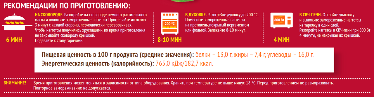 Наггетсы Мираторг куриные хрустящие замороженные - аппетитный и вкусный продукт, на приготовление которого уйдет не больше 15 минут. Наггетсы уже обжарены. Их нужно только достать из упаковки и разогреть на сковороде или в микроволновой печи. Сочные внутри и хрустящие снаружи - от такого угощения не откажутся даже дети.