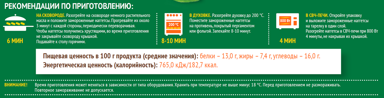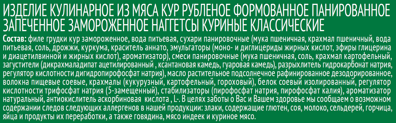 Филе грудки кур замороженное, вода питьевая, сухари панировочные мука пшеничная, крахмал пшеничный, вода питьевая, соль, дрожжи, куркума, краситель аннато, эмульгаторы моно - и диглицериды жирных кислот, эфиры глицерина и диацетилвинной и жирных кислот, ароматизатор, смеси панировочные мука пшеничная, соль, крахмал картофельный, загустители дикрахмаладипат ацетилированный, ксантановая камедь, гуаровая камедь, разрыхлитель гидрокарбонат натрия, регулятор кислотности дигидропирофосфат натрия, масло растительное подсолнечное рафинированное дезодорированное, волокна пищевые соевые, крахмалы кукурузный, картофельный, гороховый, белок соевый изолированный, регулятор кислотности трифосфат натрия 5-замещенный, стабилизаторы пирофосфат натрия, пирофосфат калия, ароматизатор натуральный, антиокислитель аскорбиновая кислота.