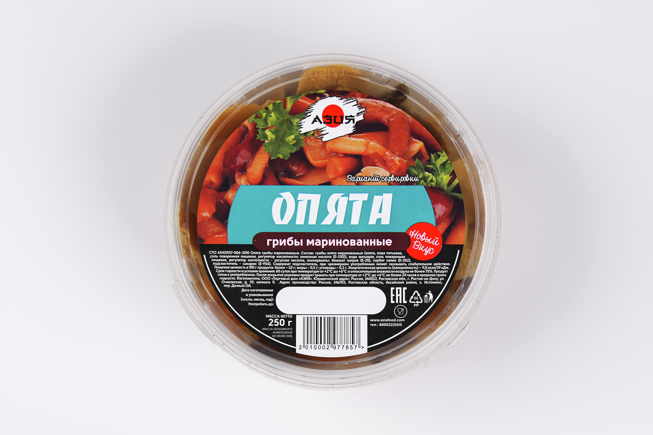Грибы опята, вода, соль, регулятор кислотности – уксусная кислота, консерванты (сорбат калия, бензоат натрия), подсластитель – сахарин.