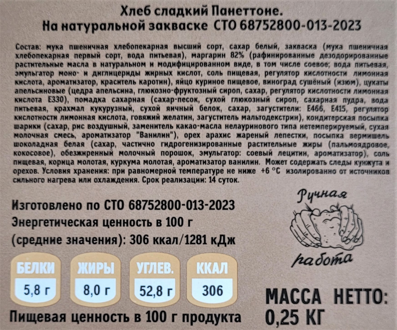 Хлеб Панеттоне сладкий от торговой марки Гридневъ – ароматное хлебобулочное изделие. Оно готовится из пшеничной муки с добавлением цукатов. Питательный полезный продукт на каждый день.