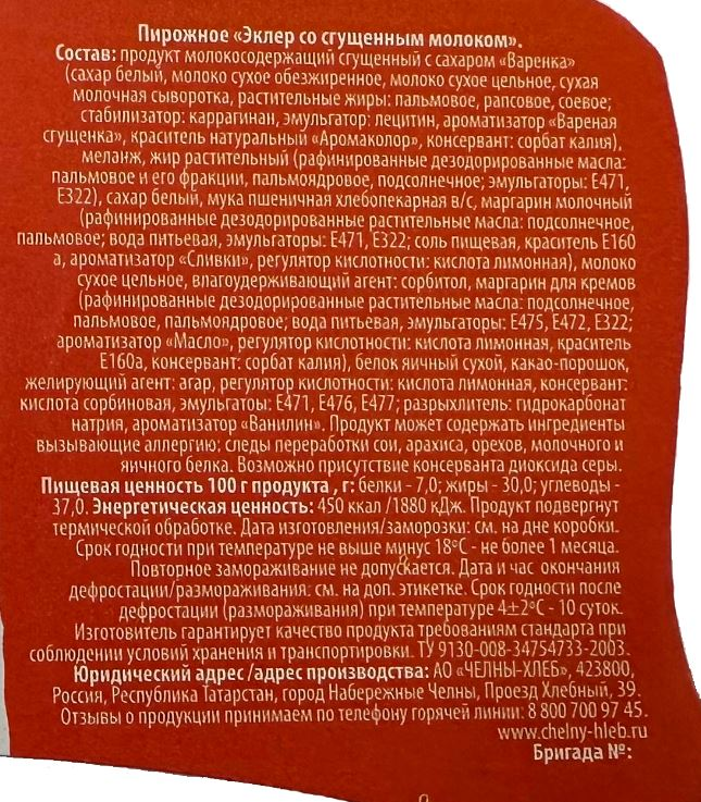 Продукт молокосодержащий сгущенный с сахаром Варенка (сахар белый, молоко сухое обезжиренное, молоко сухое цельное, сухая Молочная сыворотка, растительные жиры: пальмовое, рапсовое, соевое; стабилизатор: каррагинан, эмульгатор: лецитин, ароматизатор Вареная сгущенка, краситель натуральный Аромаколор, консервант: сорбат калия), меланж, жир растительный (рафинированные дезодорированные масла: Пальмовое и его фракции, пальмоядровое, подсолнечное; эмульгаторы: Е471, Е322), сахар белый, мука пшеничная хлебопекарная в/с, маргарин молочный (рафинированные дезодорированные растительные масла: подсолнечное, пальмовое; вода питьевая, эмульгаторы: Е471, Е322; соль пищевая, краситель Е160 а, ароматизатор Сливки, регулятор кислотности: кислота лимонная), молоко сухое цельное, влагоудерживающий агент: сорбитол, маргарин для кремов (рафинированные дезодорированные растительные масла: подсолнечное, пальмовое, пальмоядровое; вода питьевая, эмульгаторы: Е475, Е472, E322; ароматизатор Масло, регулятор кислотности: кислота лимонная, краситель Е160а, консервант: сорбат калия), белок яичный сухой, какао-порошок, желирующий агент: агар, регулятор кислотности: кислота лимонная, консервант: кислота сорбиновая, эмульгаторы: Е471, Е476, Е477; разрыхлитель: гидрокарбонат натрия, ароматизатор Ванилин.