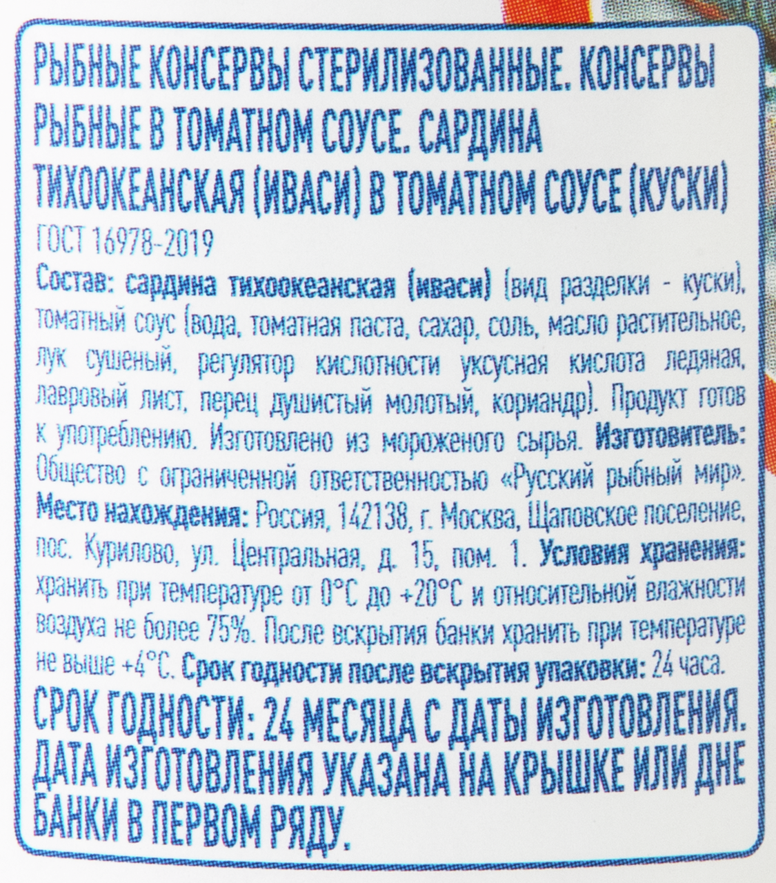 Сардина тихоокеанская (иваси), томатный соус (вода, томатная паста, сахар, соль, масло растительное, лук сушеный, регулятор кислотности уксусная кислота ледяная, лавровый лист, перец душистый молотый, кориандр).