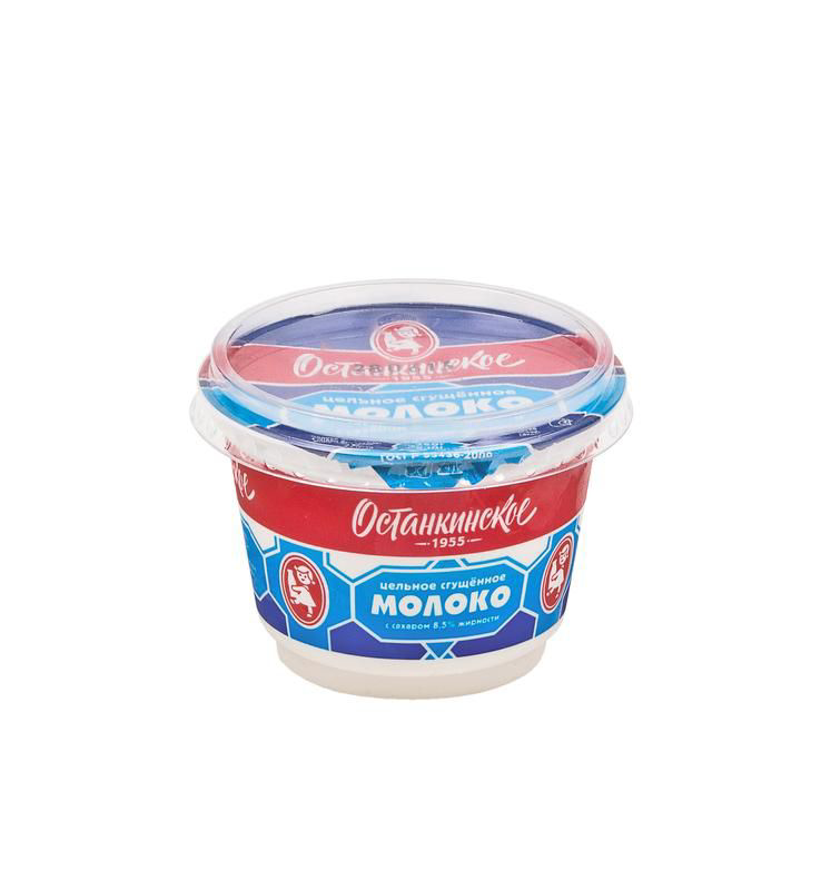 Молоко сгущенное Останкинское с сахаром 8,5% 250г. В пластиковом контейнере с прозрачной крышкой. Состав: нормализованное молоко, сахар. Пищевая ценность: жира 8,5г, белка 7,2г, углеводов 55,5г., в том числе сахарозы 43,5г. Энергетическая ценность: 327,3ккал. Хранить при Т от 0 до 10'С и относительной влажности не более 85%. Срок годности 3 месяца.