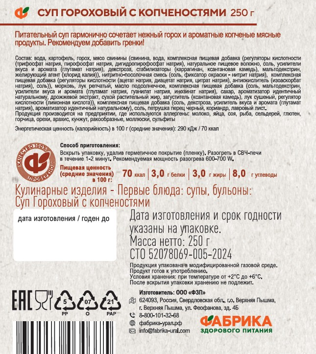 Суп Фабрика здорового питания гороховый с копченостями, 250г