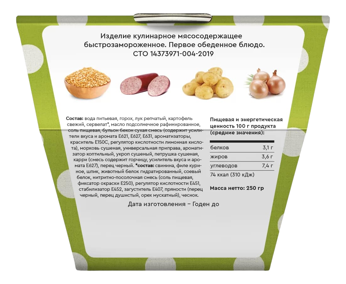 Вода питьевая, горох, лук репчатый, картофель свежий, сервелат (свинина, филе куриное, шпик, животный белок гидратированный, соевый белок, нитритно-посолочная смесь (соль пищевая, фиксатор окраски Е250), регулятор кислотности Е451, стабилизатор Е452, загуститель Е407, пряности (перец черный, перец душистый, орех мускатный), чеснок), масло подсолнечное рафинированное, соль пищевая, бульон бекон сухая смесь (содержит усилители вкуса и аромата Е621, Е627, Е631, ароматизаторы, краситель Е150с, регулятор кислотности лимонная кислота), морковь сушеная, универсальная приправа, ароматизатор коптильный, укроп сушеный, петрушка сушеная, карри (смесь содержит горчицу, усилитель вкуса и аромата Е627), перец черный.