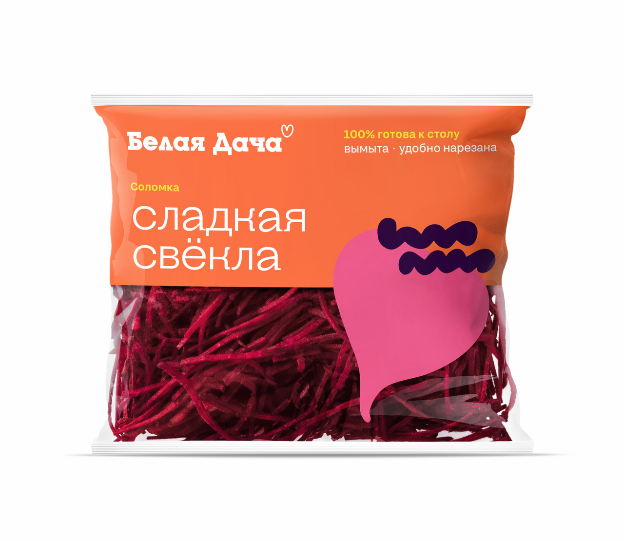Сладкая свекла соломка Белая Дача. Овощи, готовые на все! 100% готова к столу: вымыта, удобно нарезана. Свекла содержит витамины С, РР, группы В, бетаин, биофлавоноиды, а также минеральные вещества (йод, магний, калий, кальций, железо). Без добавления консервантов. Способствует усвоению белков, снижению артериального давления, регулирует жировой обмен, обладает общеукрепляющим и иммуномодулирующим действием, улучшает пищеварение и обмен веществ, выводит шлаки из организма. Ее можно использовать в качестве салата с чесноком, черносливом и грецкими орешками, ну и конечно для приготовления зажарки для борща. Белая Дача - вкус здоровой жизни! Если бы наши салаты могли сказать пару слов о себе, это звучало бы так: Вкусные и полезные! Спасибо, что вместе с нами по��держиваете культуру здорового питания.