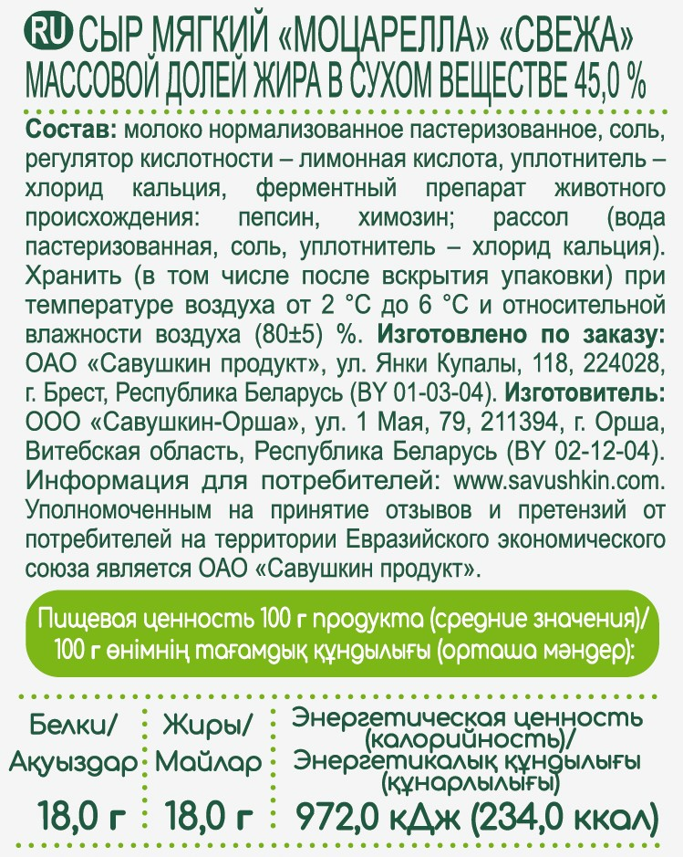 Молоко нормализованное пастеризованное, регулятор кислотности - лимонная кислота, соль, уплотнитель - хлорид кальция, ферментный препарат животного происхождения – пепсин, химозин, рассол (вода питьевая, соль, уплотнитель - хлорид кальция).