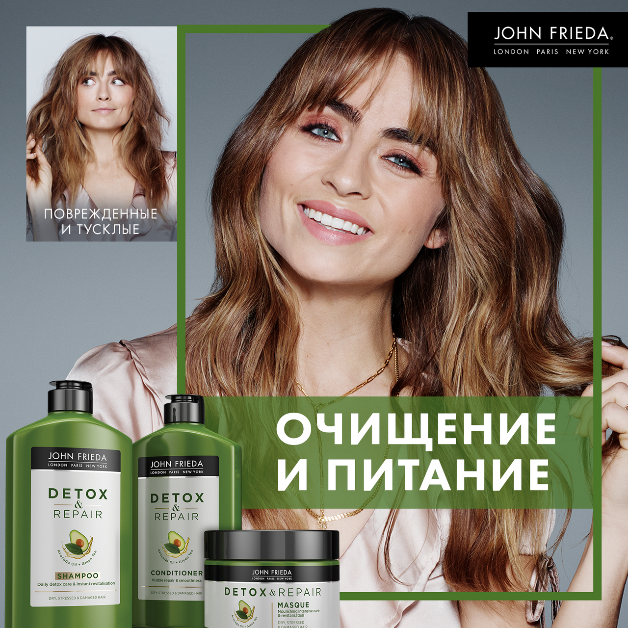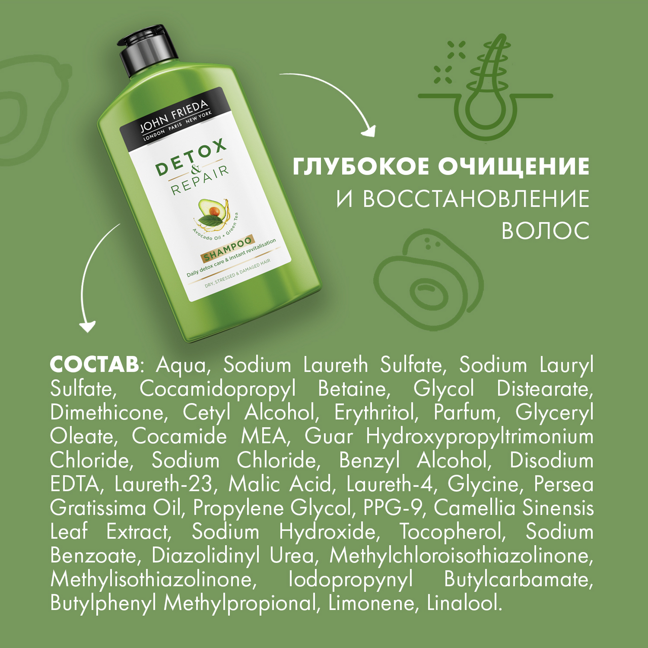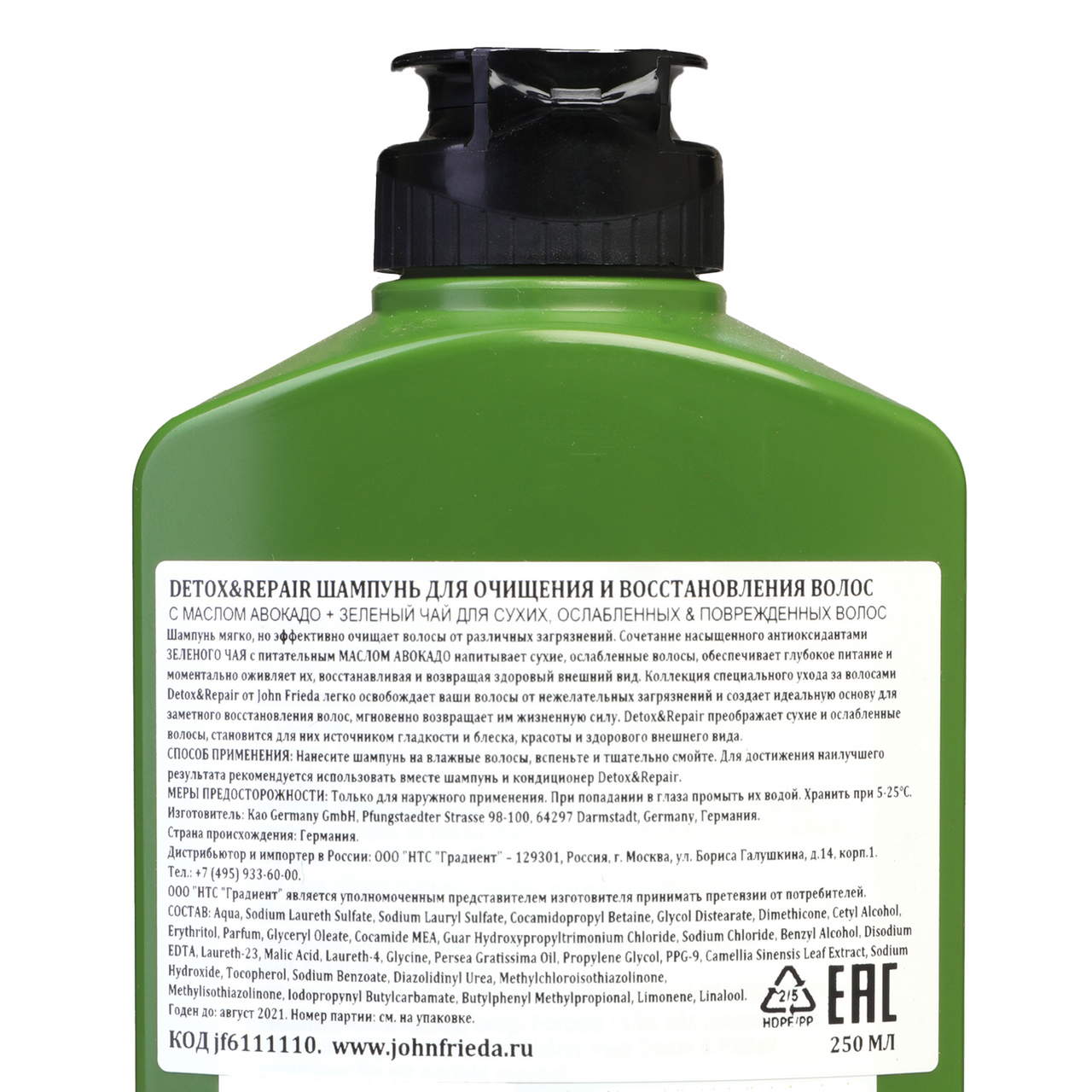 Шампунь марк�� John Frieda из специальной коллекции Detox&Repair мягко, но эффективно очищает волосы, создает идеальную основу для заметного восстановления, возвращает им жизненную силу и оживляет внешний вид, даря гладкость и блеск. В составе — насыщенный антиоксидантами зеленый чай и питательное масло авокадо. Для наилучшего результата рекомендуется использовать шампунь вместе с кондиционером и маской Detox&Repair.Способ применения: нанесите шампунь на влажные волосы, вспеньте и тщательно смойте.