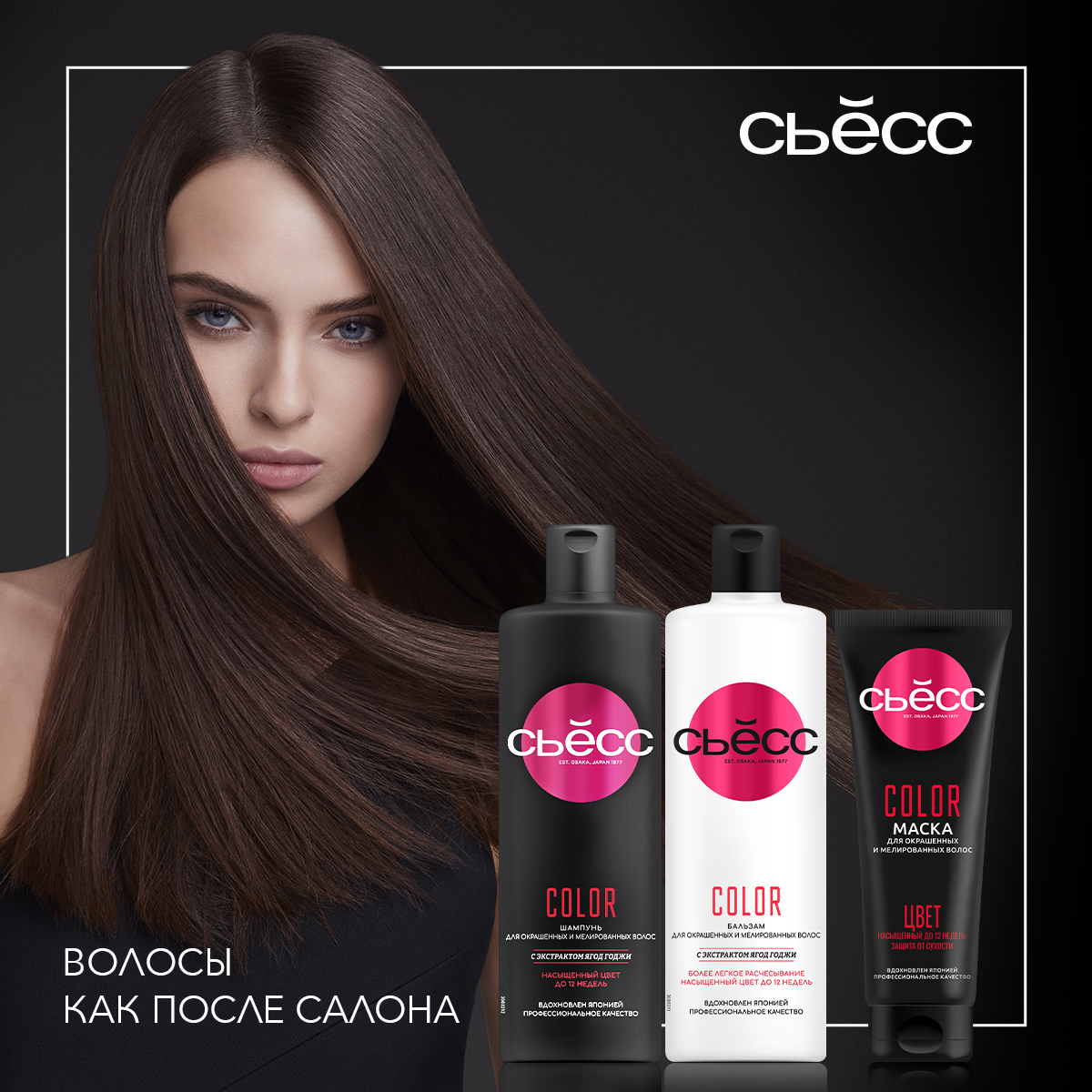 С момента основания Сьесс в Осаке в 1977 году наша миссия – предоставлять средства профессионального качества, чтобы ваши волосы всегда выглядели красивыми и ухоженными как после салона. Профессиональные формулы, вдохновленные Японией, соединяют в себе натуральные ингредиенты и передовые технологии в уходе за волосами. Сьесс маска для волос Color для окрашенных и мелированных волос: защищает цвет от потускнения до 12 недель; усиливает насыщенность цвета и блеск; интенсивно питает.