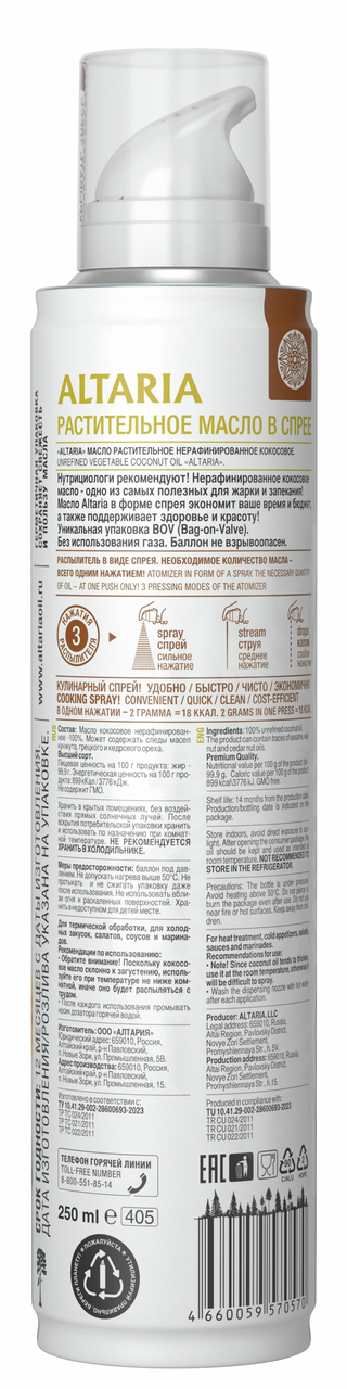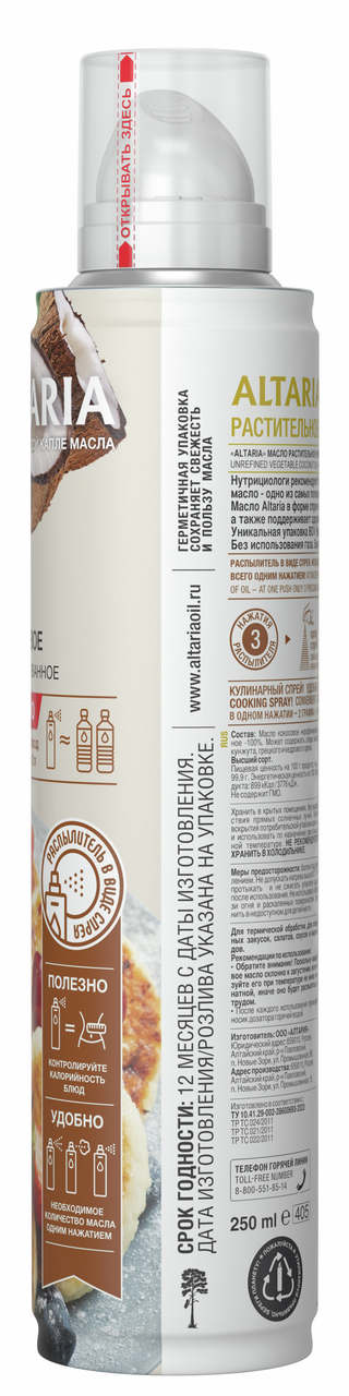 Масло-спрей кокосовое Altaria нерафинированное, 250мл