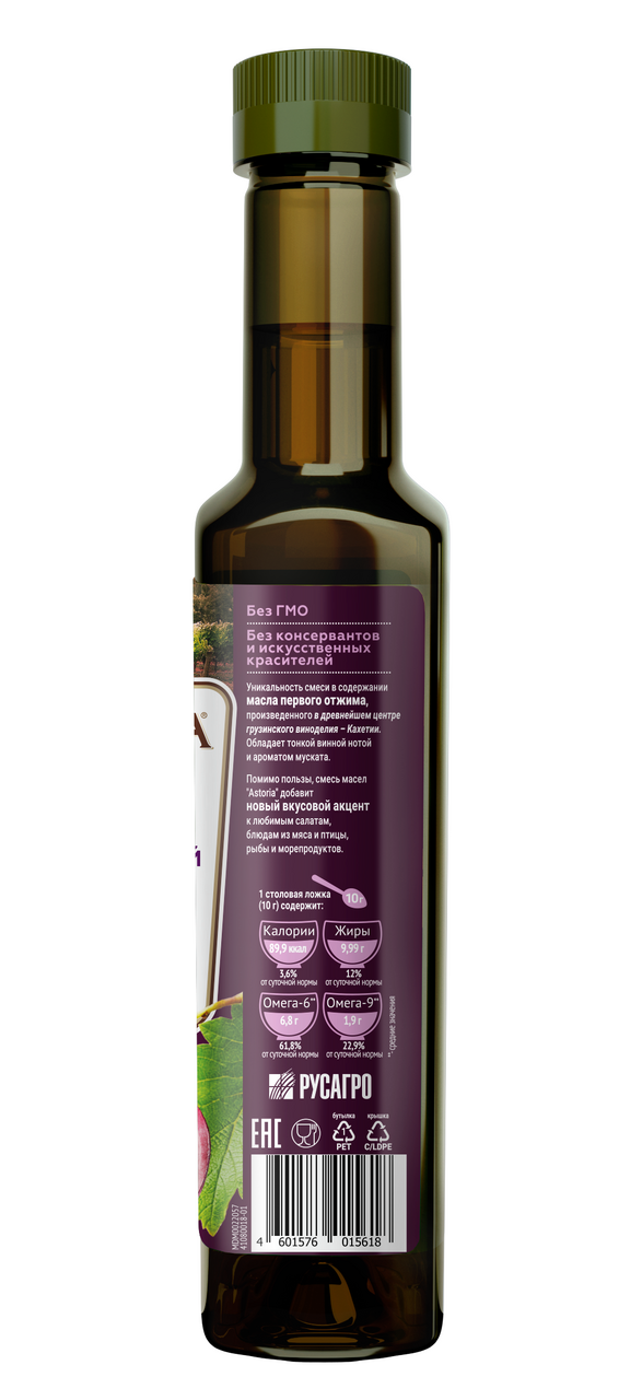 Уникальность смеси в содержании масла первого отжима, произведённого в древнейшем центре грузинского виноделия - Кахетии. Обладает тонкой винной нотой и ароматом муската. Помимо пользы, смесь масел Astoria добавит новый вкусовой акцент к любимым салатам, блюдам из мяса и птицы, рыбы и морепродуктов.
