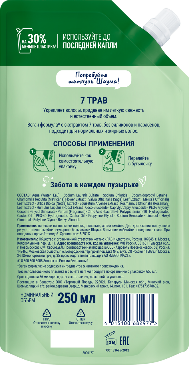 7 Трав шампунь с экстрактами трав свежесть и объем для нормальных и жирных волос: - Укрепляет волосы от корней до самых кончиков- Дарит волосам свежесть -Для ухоженных волос и естественного объема -Ухаживающая веган формула обогащена комплексом микроэлементов, витаминами и протеином для сильных и красивых волос от корней до кончиков - Не содержит парабенов и силиконов
