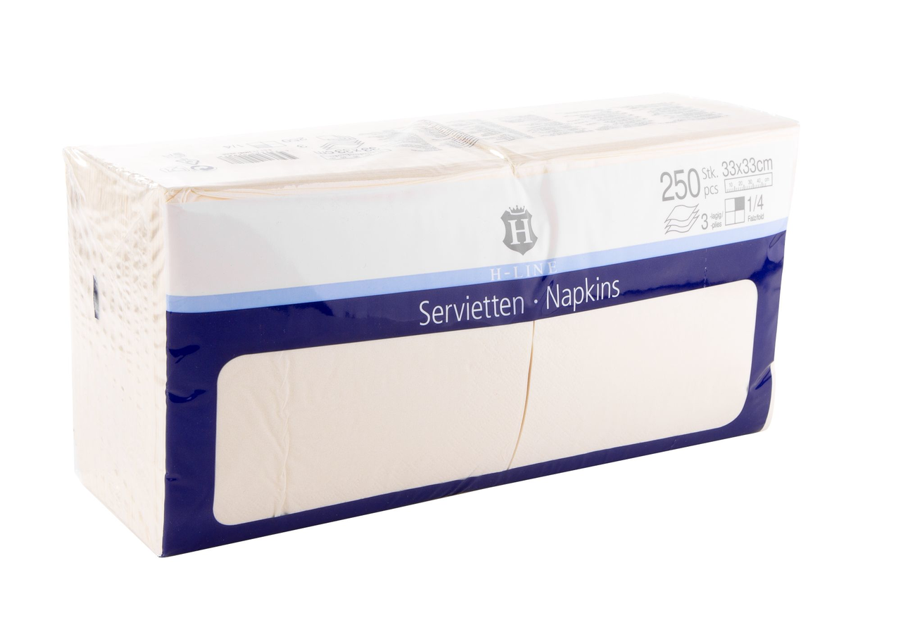 Салфетки бумажные трехслойные H-Line для применения на кухне, на предприятиях общественного питания: закусочных, столовых, кафе, ресторанах. Цвет: шампань. Размер: 33 х 33 . В упаковке 250 штук.