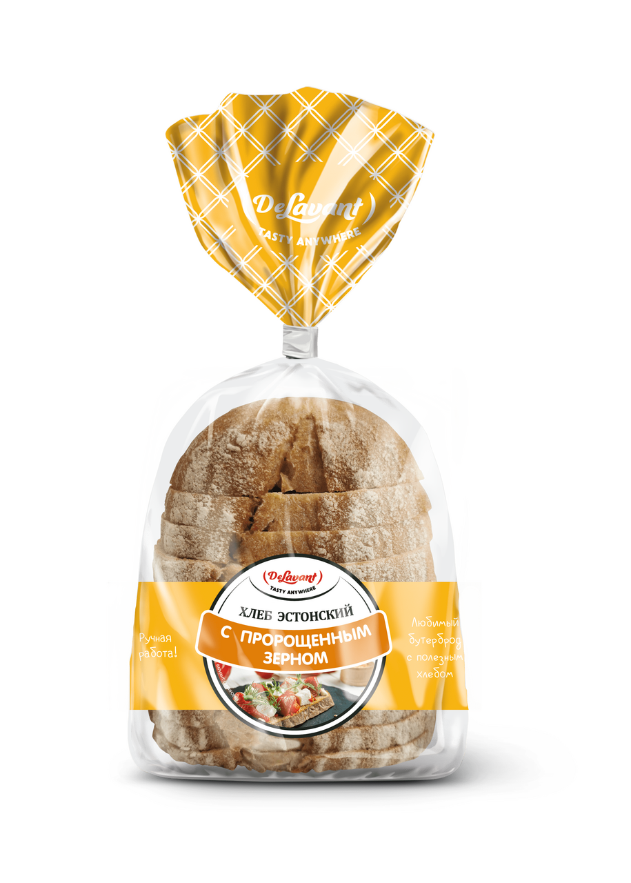Хлеб Эстонский с пророщенным зерном в нарезке от торговой марки DELAVANT – это пшенично-ржаной хлеб на закваске собственного производства с добавлением осолодованного зерна ржи, а также семян льня, тыквы, овсяных хлопьев. Такой состав обогащает организм клетчаткой, витамином Д, минералами и необходимыми аминокислотами.