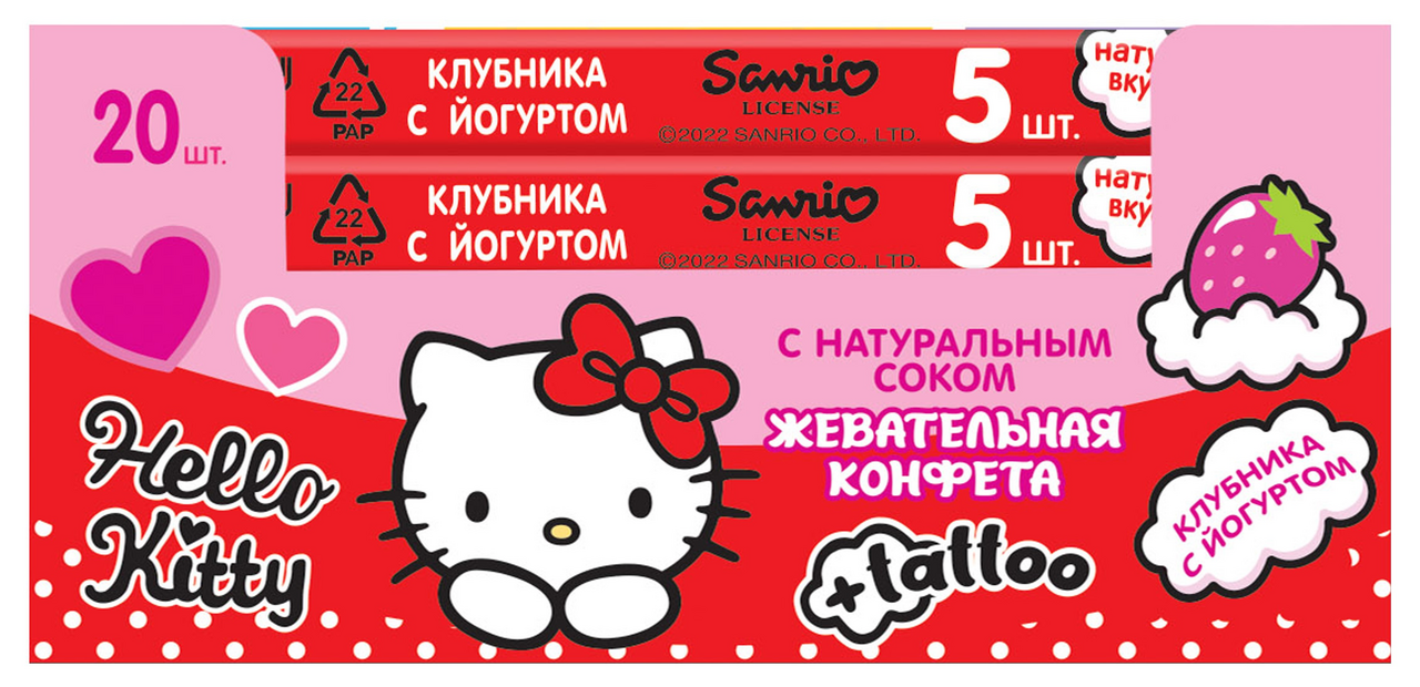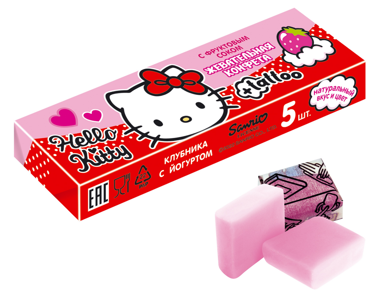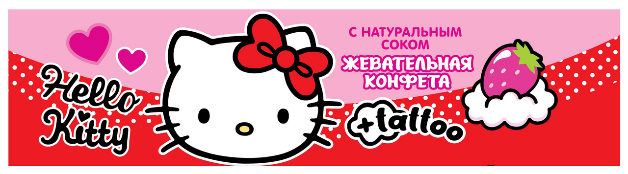 Жевательная конфета со вкусом клубника с йогуртом и крутыми переводными изображениями (тату) Hello Kitty.Без пальмового масла. С натуральным фруктовым соком. На натуральном кокосовом масле. С натуральными ароматизаторами.В каждом стике - 5 конфеток и 5 переводных изображений Hello Kitty. Всего в коллекции 12 тату.