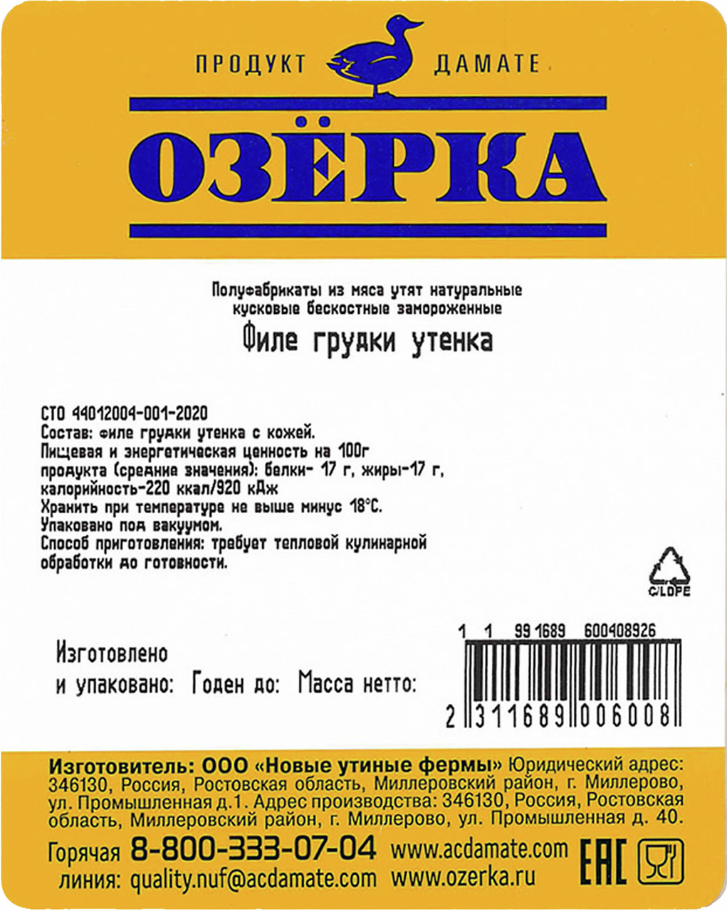 Филе грудки утенка Озёрка замороженное, ~1кг