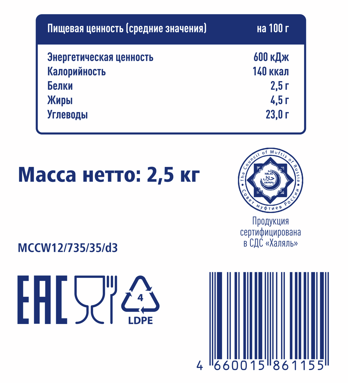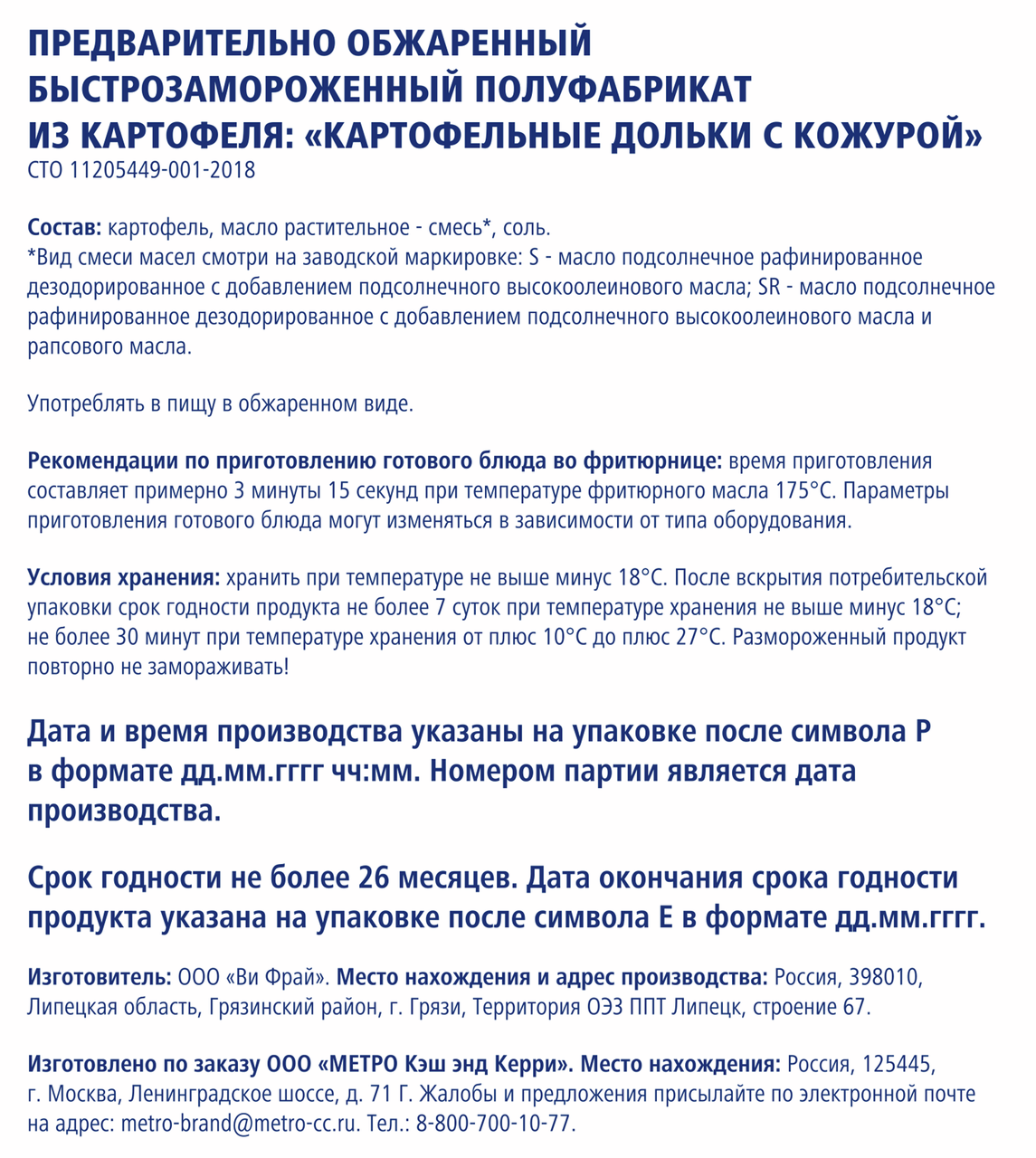 Рекомендации по приготовлению готового блюда во фритюрнице: время приготовления составляет примерно 3 минуты 15 секунд при температуре фритюрного масла 175 С. Параметры приготовления готового блюда могут изменяться в зависимости от типа оборудования