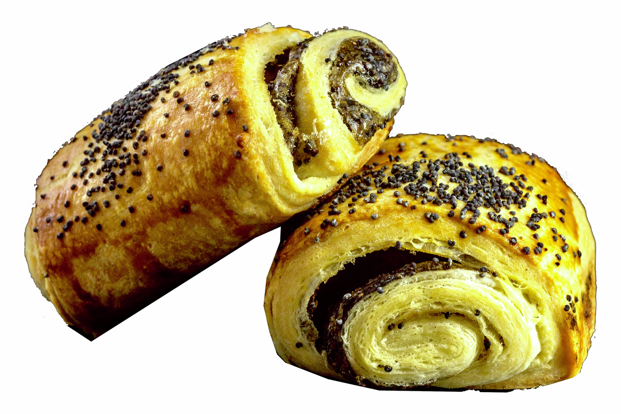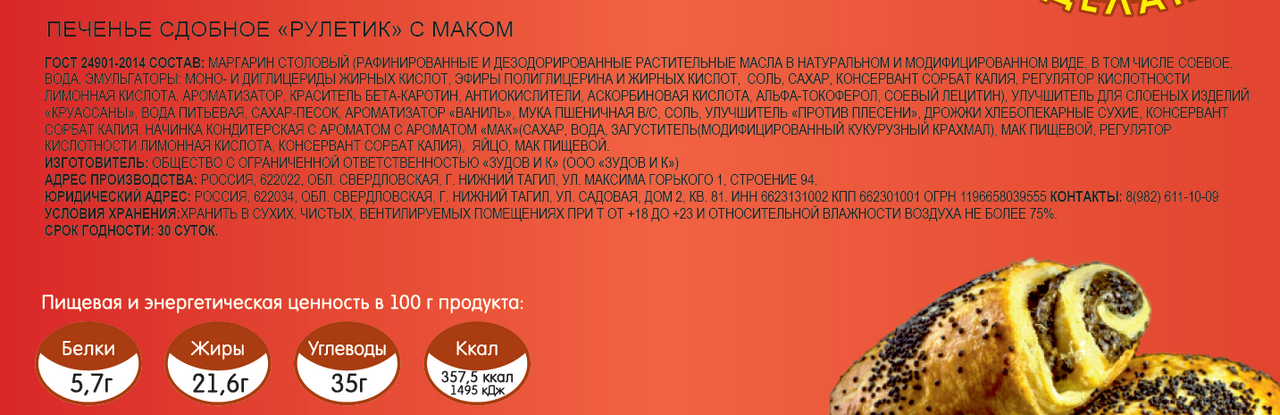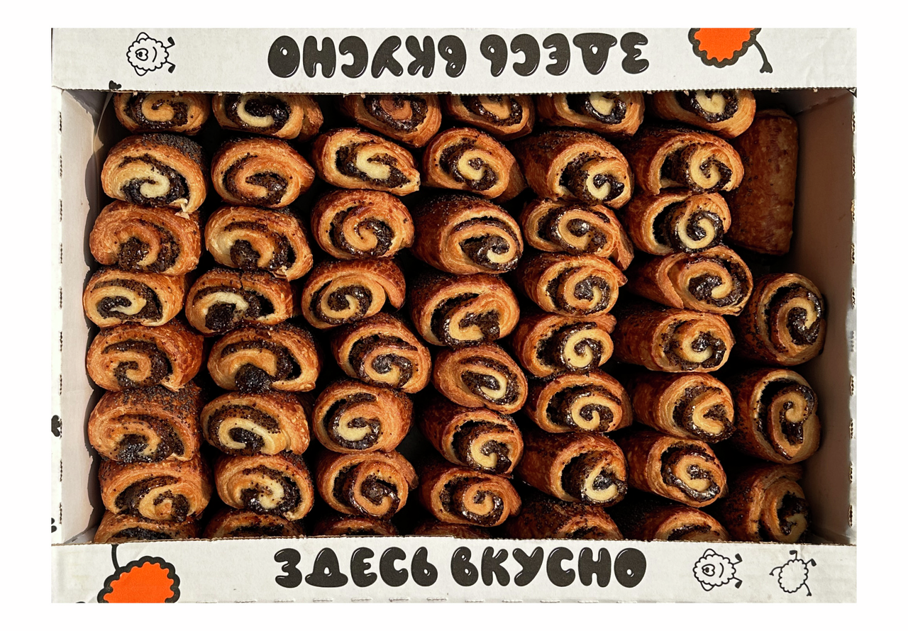 Маргарин столовый (рафинированные и дезодорированные растительные масла в натуральном и модифицированном виде, в том числе соевое, вода, эмульгаторы: моно- и диглицериды жирных кислот, эфиры полиглицерина и жирных кислот, соль, сахар, консервант сорбат калия, регулятор кислотности лимонная кислота, ароматизатор, краситель бета-каротин, антиокислители, аскорбиновая кислота, альфа-токоферол, соевый лецитин), улучшитель для слоеных изделий Круассаны, вода питьевая, сахар-песок, ароматизатор Ваниль, мука пшеничная в/с, соль, улучшитель Против плесени, дрожжи хлебопекарные сухие, консервант сорбат калия, начинка кондитерская с ароматом с ароматом Мак (сахар, вода, загустителя (модифицированный кукурузный крахмал), мак пищевой, регулятор кислотности лимонная кислота, консервант сорбат калия), яичный порошок, мак пищевой.