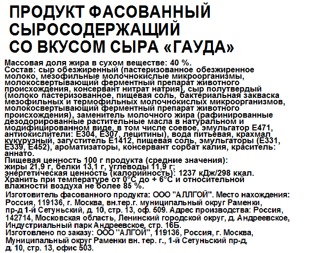 Сыр обезжиренный (пастеризованное обезжиренное молоко, мезофильные молочнокислые микроорганизмы, молокосвертывающий ферментный препарат животного происхождения, консервант нитрат натрия), сыр полутвердый (молоко пастеризованное, пищевая соль, бактериальная закваска мезофильных и термофильных молочнокислых микроорганизмов, молокосвертывающий ферментный препарат животного происхождения), заменитель молочного жира (рафинированные дезодорированные растительные масла в натуральном и модифицированном виде, в том числе соевое, эмульгатор Е471, антиокислители: Е304, Е307, лецитины), вода питьевая, крахмал кукурузный, загуститель Е1412, пищевая соль, эмульгаторы (Е331, Е339, Е452), ароматизаторы, консервант сорбат калия, красители: каротины, аннато.