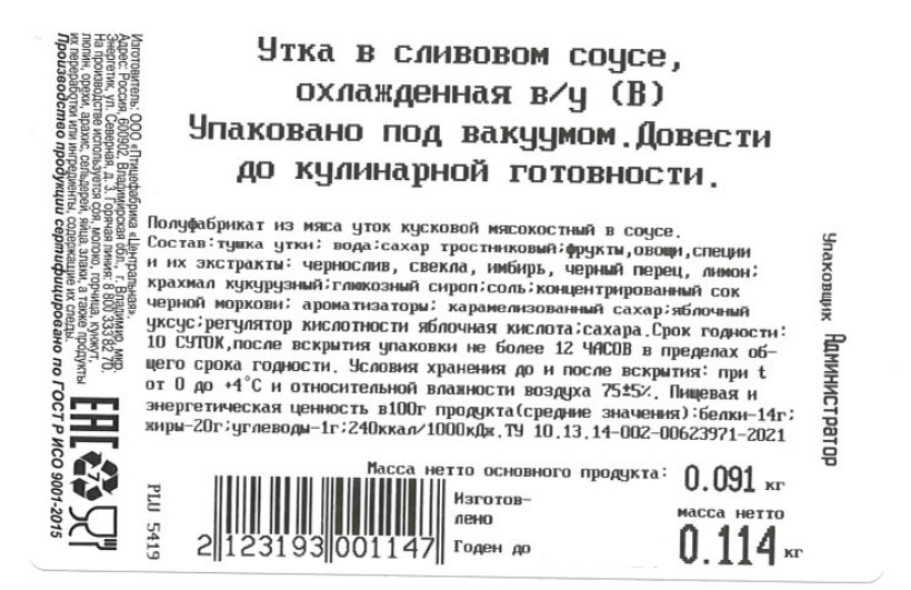 Тушка утки, вода, сахар тростниковый, фрукты, овощи, специи и их экстракты, чернослив, свекла, имбирь, черный перец, лимон, крахмал кукурузный, глюкозный сироп соль концентрированный сок черной моркови, ароматизаторы, карамелизованный сахар, яблочный уксус, регулятор кислотности яблочная кислота, сахара.