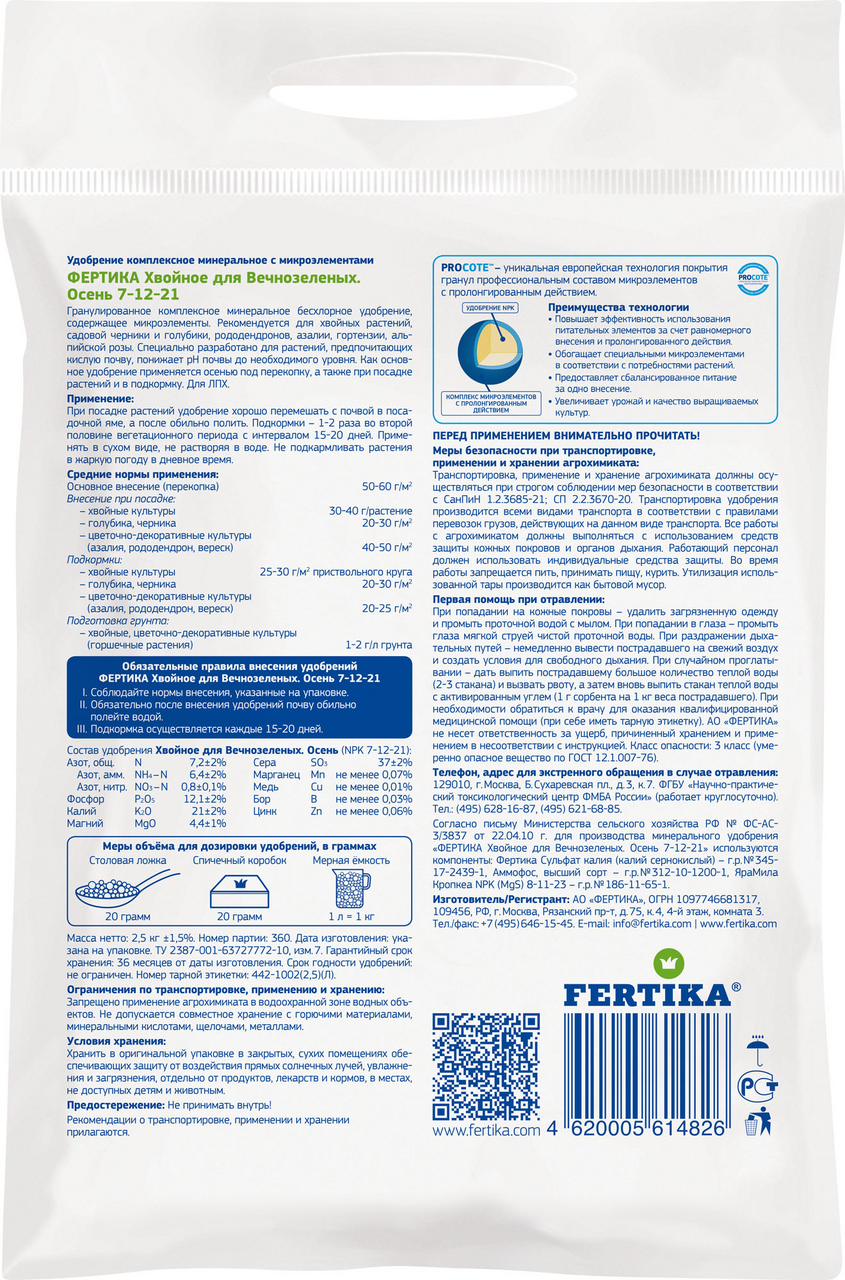 Комплексное минеральное бесхлорное удобрение для хвойных растений и культур, содержащее микроэлементы. Рекомендуется для хвойных растений, садовой черники и голубики, рододендронов, азалий, гортензий, альпийских роз. Специально разработано для растений, предпочитающих кислую почву, понижает ph почвы до необходимого уровня. Как основное удобрение применяется осенью под перекопку, а также при посадке растений и в подкормку.