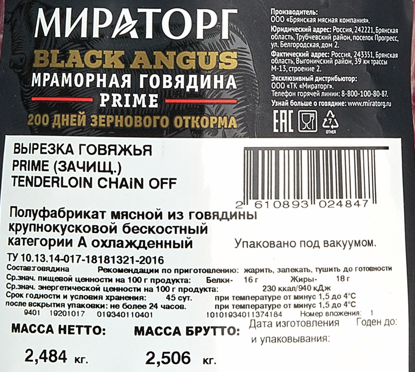 Вырезка говяжья Мираторг Prime свежемороженая, ~2.5кг