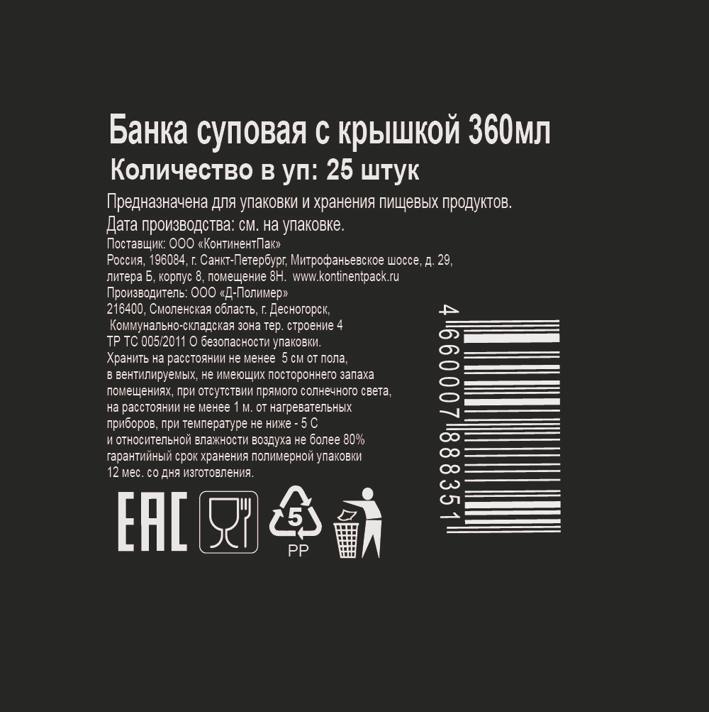 Банка суповая с крышкой пластиковая черная 360мл, 25шт
