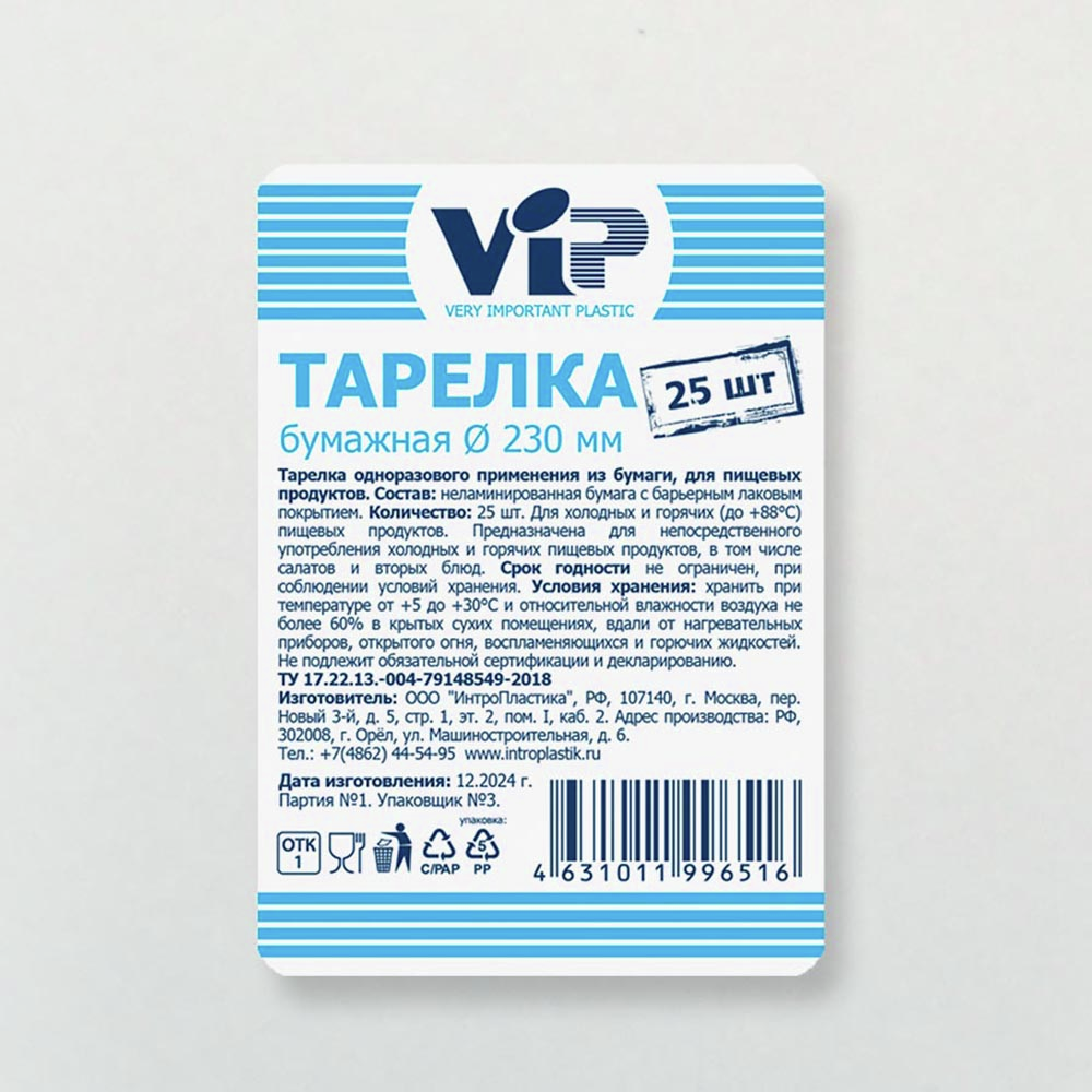 Тарелка Vip бумажная, 230 мм, 25 шт. прекрасно подойдет для пикника или домашнего праздника. Набор предназначен для одноразового использования, поэтому тарелки не нужно мыть. Изделия изготовлены из экологически чистого бумажного волокна, за счет чего еда в них не изменяет вкус и аромат. В них можно помещать горячую пищу или использовать для разогрева блюд в микроволновой печи. В упаковке – 50 тарелок. Одной пачки вполне хватит, чтобы накрыть стол на целую компанию.
