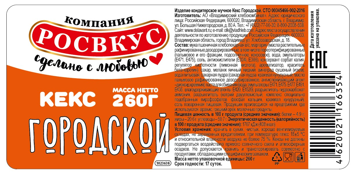 Мука пшеничная хлебопекарная высшего сорта, маргарин (масла растительные рафинированные дезодорированные, в том числе переэтерифицированные: пальмовое и его фракции, подсолнечное, кокосовое, вода, эмульгаторы (Е471, Е475), соль, антиокислители (Е304i, Е306), регулятор кислотности (лимонная кислота), ароматизатор, красители (Е100, Е160b)), сахар-песок, яйцо куриное, виноград сушеный (изюм), вода питьевая, паста для сбивания (вода, сахар, эмульгаторы (Е470, Е471, Е475), влагоудерживающие агенты (Е 422, Е1520), консервант (Е202), разрыхлители: гидрокарбонат аммония, крахмал кукурузный, разрыхлитель (Е500ii), регулятор кислотности (Е341i, Е450i), регуляторы кислотности (Е341, Е450), соль поваренная пищевая экстра.