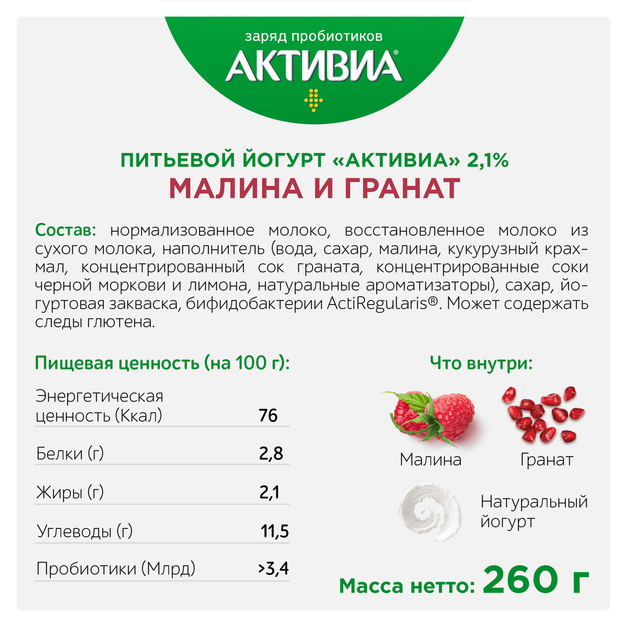 Йогурт питьевой Активиа малина и гранат 2.1%, 260г