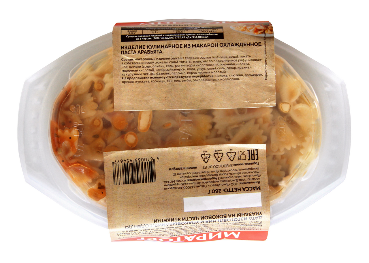 Макаронные изделия мука из твердых сортов пшеницы, вода, томаты в собственном соку томаты, соль, томаты, вода, масло подсолнечное рафинированное, оливки вода, оливки, соль, регуляторы кислотности лимонная кислота, молочная кислота, каперсы каперсы, вода, уксус, соль, соль, сахар, крахмал кукурузный, чеснок, базилик, паприка, перец черный молотый. На предприятии используются продукты переработки: молока, глютена, сельдерея, орехов, кунжута, горчицы, яиц, рыбы, ракообразных и моллюсков.