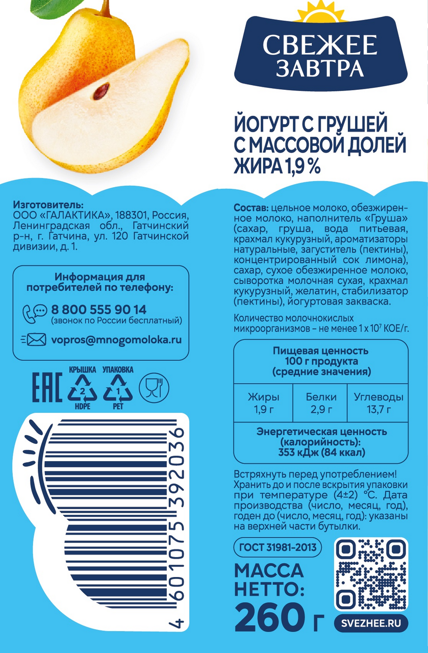 Йогурт Свежее завтра груша ГОСТ 1.9%, 260г