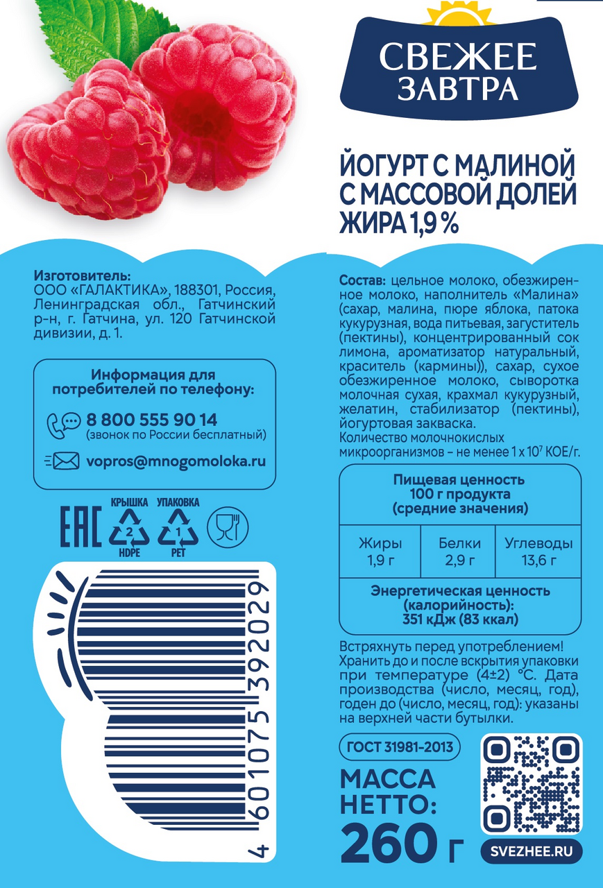Йогурт Свежее завтра малина ГОСТ 1.9%, 260г
