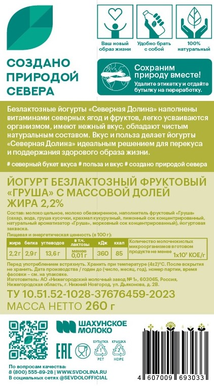 Легкий нежный продукт с потрясающим вкусом груши в новом удобном формате упаковки. Созданный природой Севера, безлактозный йогурт обладает 100% натуральным составом с сохранением всех полезных свойств. Продукт прекрасно подходит для завтрака, приготовления различных десертов и выпечки, рекомендуем его и как заправку для салатов. Безлактозные йогурты Северная Долина наполнены витаминами северных ягод и фруктов, легко усваиваются организмом, имеют нежный вкус, обладают чистым натуральным составом. Вкус и польза делают йогурты Северная Долина идеальным решением для перекуса и поддержания здорового образа жизни.