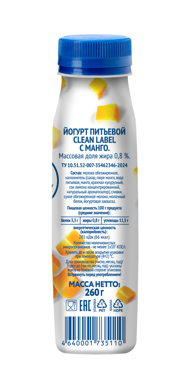 Йогурт питьевой Viola с манго 0.8%, 260г - йогурты Viola Clean Label созданы в соответствии с концепцией чистая этикетка, то есть без использования пищевых добавок с Е - кодами. В составе только простые и понятные ингредиенты: молоко, сахар, натуральные фрукты и ягоды, закваска. Также йогурты Viola Clean Label гарантированно не содержат глютен. Для производства йогуртов Viola используется молоко сорта Elite – молоко высочайшего качества от российских молочных хозяйств, прошедших специальную аттестацию компании.
