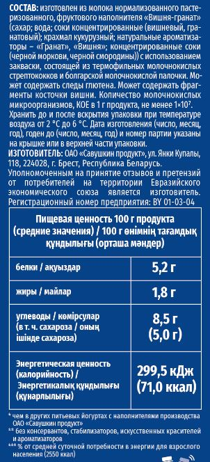 Изготовлен из молока нормализованного австеризованного, фруктового наполнителя Вишня-гранат сахар; сок концентрированный черничный; вода; крахмал кукурузный; глюкозно-фруктозный сироп; соки концентрированные вишневый, гранатовый; натуральные ароматизаторы - Вишня, Гранат; концентрированные соки черной моркови, черной смородины с использованием закваски, состоящей из термофильных молочнокислых стрептококков и болгарской молочнокислой палочки. Может содержать следы глютена.