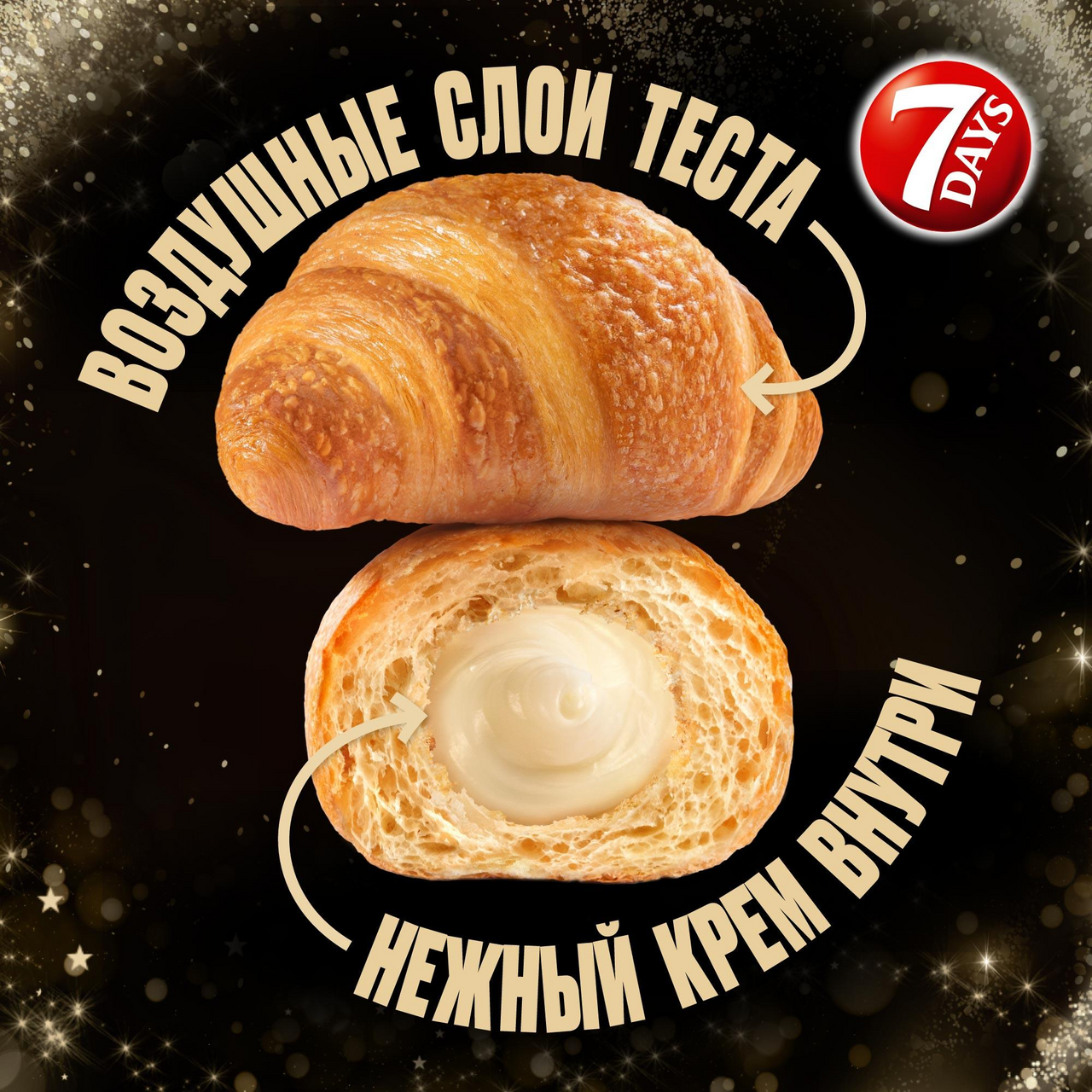 Участвует в конкурсе: Выиграйте кофемашину на сладкое! Совершите покупку товаров-участников на сумму от 1500₽ с 23 октября 2025г. по 14 января 2026г. и получите шанс выиграть кофемашину или другие сладкие призы! Чем больше покупок - тем больше шансов на победу! Подробнее об акции - https://cdn.metro-cc.ru/ru/mndlz_2025.pdf. Мини круассаны 7Days - воздушные круассаны из мягкого слоеного теста с нежной кремовой начинкой. Идеальное сочетание оригинального насыщенного вкуса, нежной текстуры и высокого качества для настоящих ценителей сладостей.