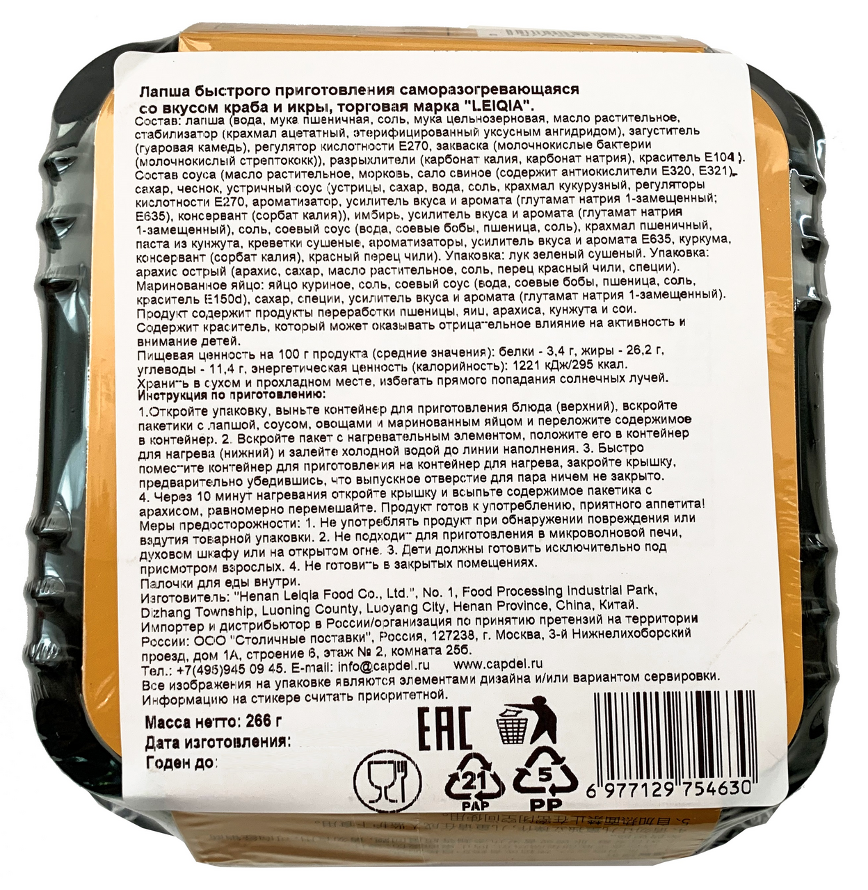 Лапша быстрого приготовления Lei Qia саморазогревающаяся краб и икра, 266г